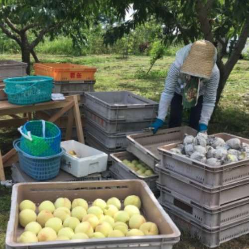 桃の袋掛けしたり、選別したり、その後は収穫した果物を使ったお料理をアウトドアで楽しみます。