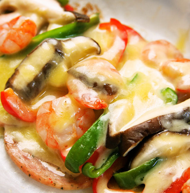大き目のクッキングシートの上にソーセージや季節の野菜、エビなどを乗せ、上からチーズを乗せたら周囲のシートで蓋をしてフライパンで焼きます。野菜などに火が通ったら出来上がり?
